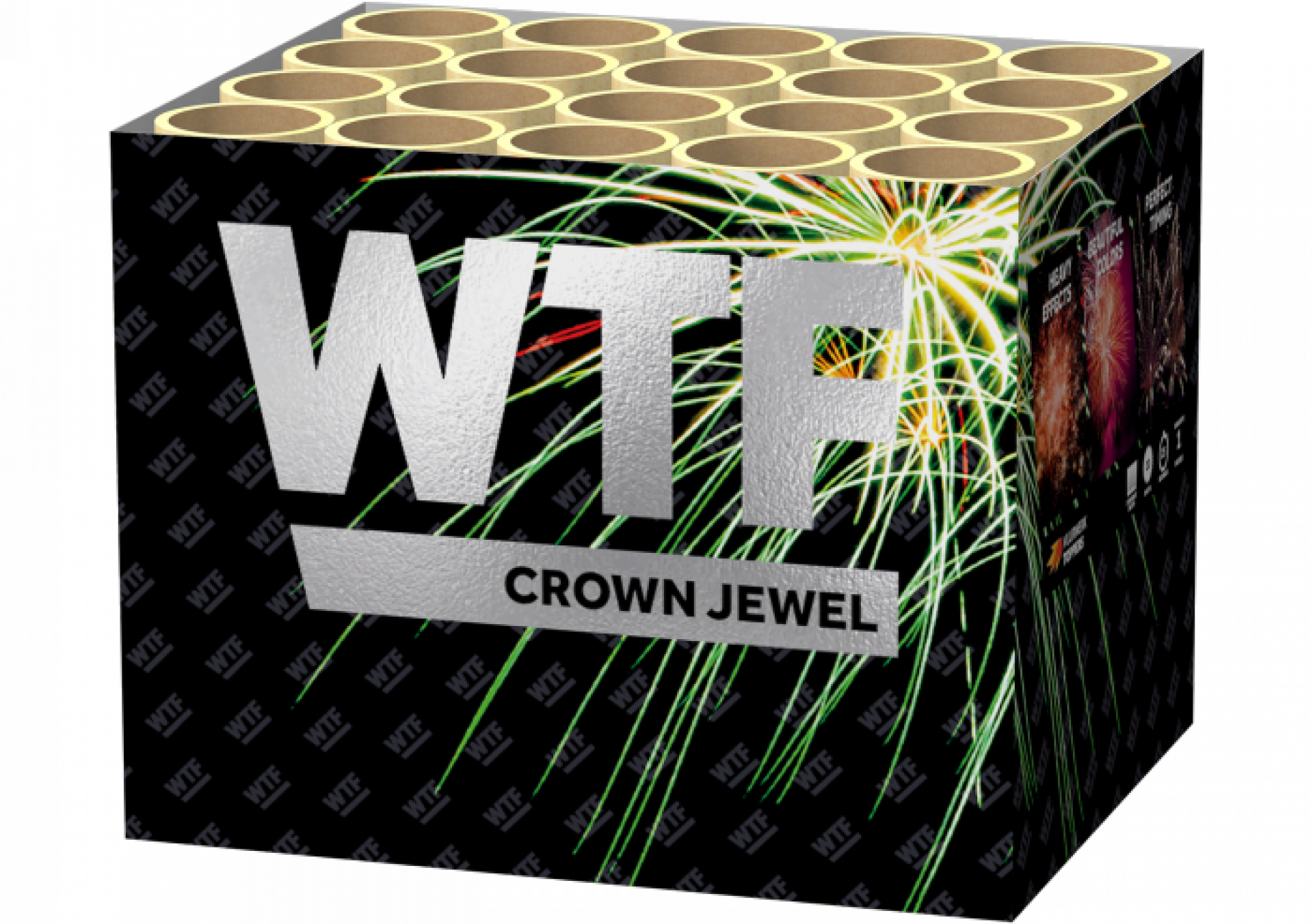 De Crown Jewel laat de lucht dansen met zwemmende sterren in rood, groen en geel. Twintig knallende schoten die samen een fonkelende kroon vormen.