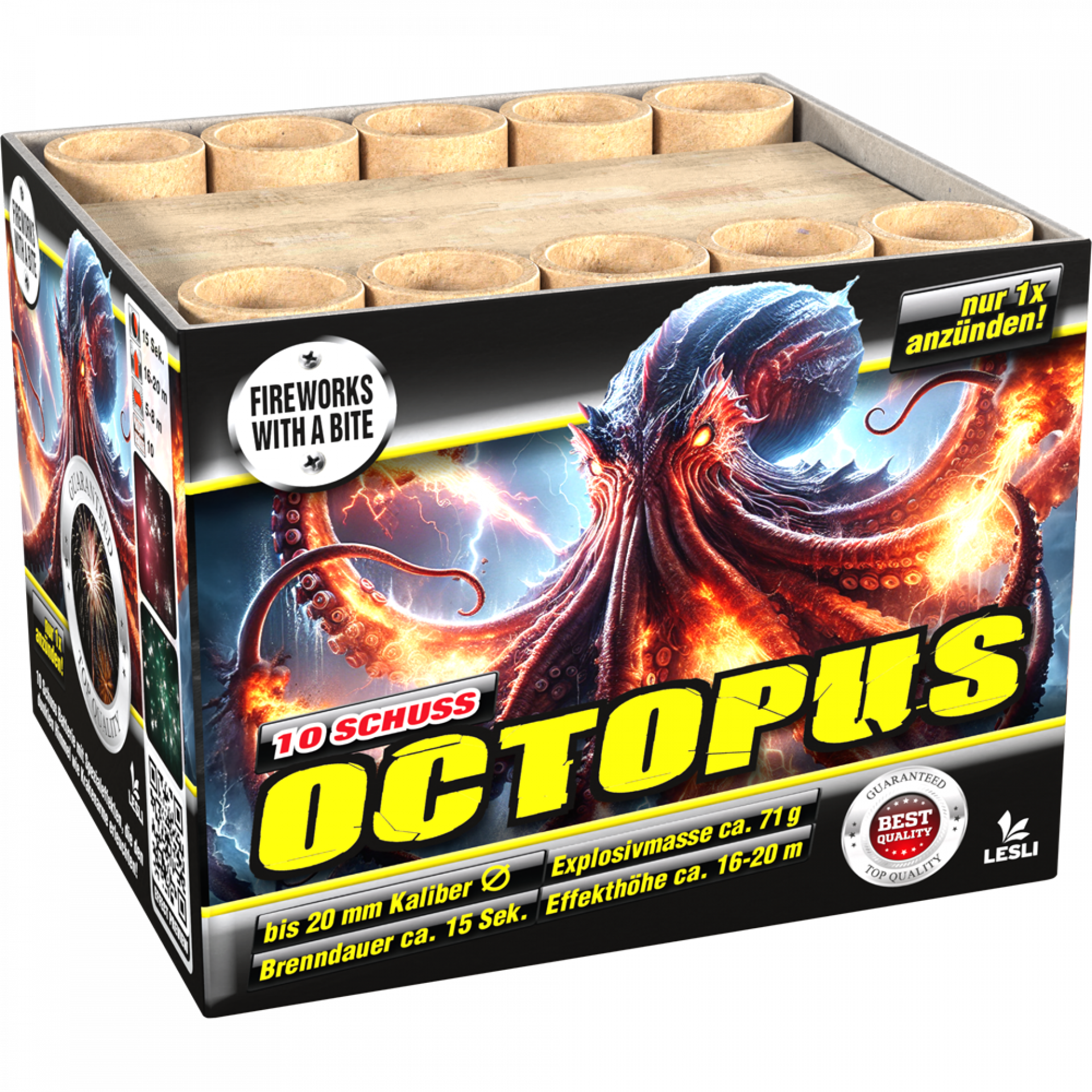 10-schots batterij met speciale effecten die de donkere hemel oplichten als octopusarmen!